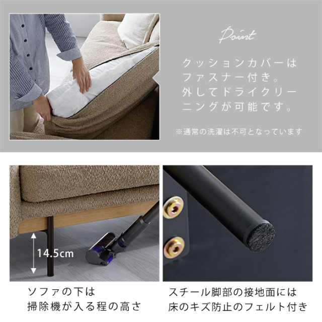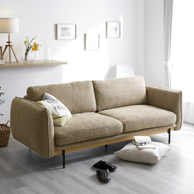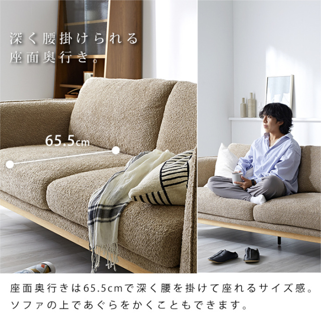 | ふわふわ生地とひろびろ座面に癒される。 【ブークレ生地 三人掛けソファ Sean(ショーン)】 広い座面で三人掛けもらくらく。 座り心地よくリラックスの「まったりタイム」を楽しむことができる、贅沢ソファです。 ソファの張地には、欧米で流行のブークレ生地を採用。 小さなループ状の糸の輪で作られ、細かな起毛と柔らかな風合いが特徴の、もこもこの手触りがたまらないファブリックです。 天然木製のフレームに、スチール製の脚のデザインがおしゃれなポイント。 木とスチールの組み合わせは好相性で、木製フレームがお部屋に温かみを与え、スチール脚が雰囲気を引き締めます。 ソファは座面幅166cmで、ごろ寝もできるサイズ感。 寝転がってリラックスタイムを過ごせます。 座面奥行きは65.5cmで深く腰を掛けて座れる仕様。 ソファの上であぐらをかくこともできますよ。 座面中材にはフェザー(羽毛)やウレタンを使用。 程よい弾力と柔らかさでしっかり体を支えます。 脚は六角レンチで簡単に取り外しでき、脚を外してローソファとしてのお使いもいただけます。 | |