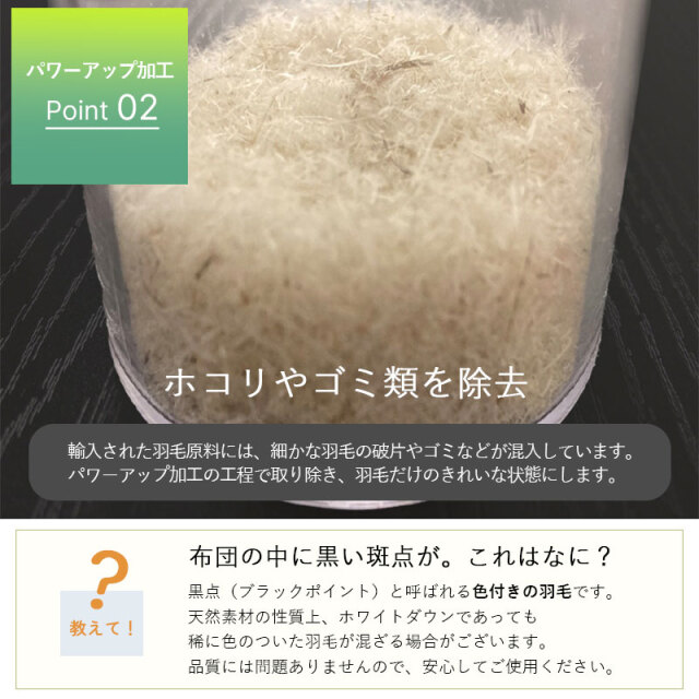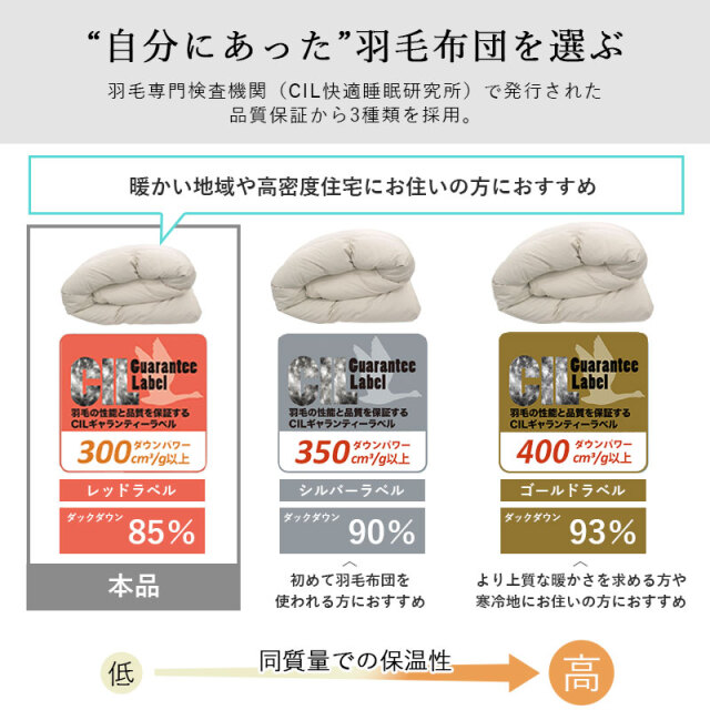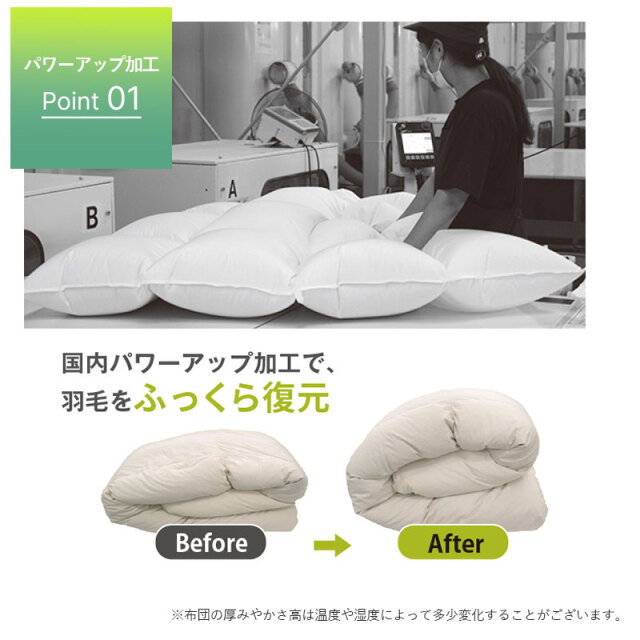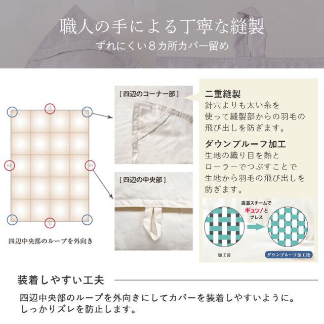 | 注意事項 | (備考) メーカー保証(1年)あり (注意事項) ・中身の羽毛がつぶれてしまうと、羽毛本来の力を発揮できなくなってしまいます。 上には重いものを乗せずに収納する場合は、上段にしまってください。 ・しばらく使用しない場合は、一度天日干しを施してから、湿気の少ない場所に保管ください。 ・ダニやカビを防ぐため、使用しない間でも月に1~2回は天日干し、収納場所は湿気を取り除いてください。 ・本商品の側生地には麻(リネン)を使用しております。麻は天然繊維であり、素材特有の糸節、ネップ(繊維のかたまり)、スラブ(不規則な筋)、異原糸(色糸)等が、生地に織り込まれているいる場合がございます。これらは、素材の特性上、素材本来の風合いとして完全に防ぐことが出来ませんので、予めご了承ください。 【ダウンケット(肌掛けふとん)0.3kg】 収納用の不織布バッグに入れてお届けいたします。 専用ホックが付属しておりお手持ちの布団で2枚合わせにも対応可能です。 ウォッシャブル可(洗濯ネット要) 【合掛けふとん 0.6kg】 小さく脱気圧縮梱包(COMO)にてお届けいたします。 圧縮されていた布団を取り出した後に、空気を含ませるように布団を振っていただくと、羽毛が元の状態に戻りやすくなります。 ウォッシャブル不可 |