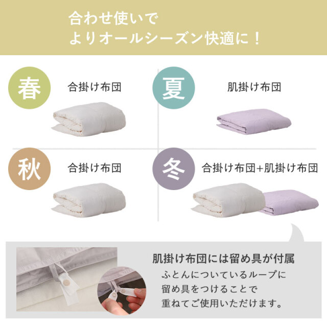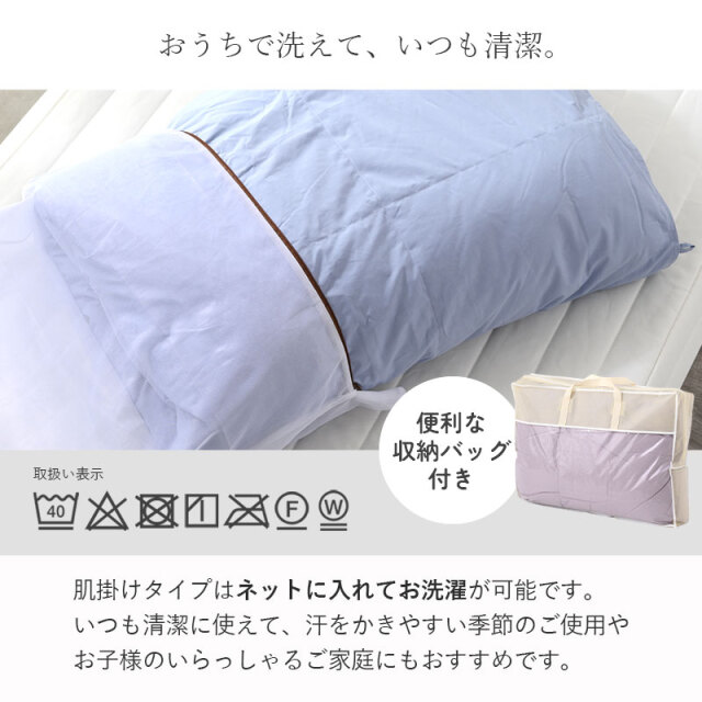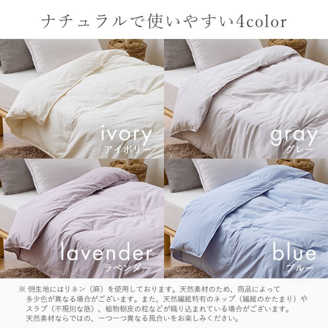 | 軽くて、やわらかい。ムレにくく、いつも清潔。 1年中使いたい羽毛布団。 Natureriel-ナチュレリエル- こんなお悩みありませんか? タオルケットだと肌寒い...布団や毛布をかぶっていると汗をかいて起きてしまう...季節によって布団を変えているので収納スペースがいっぱいに... ナチュレリエルは、ちょうどいい温度・寝心地を保って、朝まで快適に眠れる羽毛布団です。 側生地には、天然素材であるフレンチリネンと、通常ポリエステル糸の4倍の細さの極細繊維を採用しました。 綿の4倍の吸水性とすばやく発散する速乾性をあわせもつ麻生地(リネン)は、さらっとした肌触りと通気性の高さが魅力で、使い込むほど柔らかくなり、長く風合いを楽しむことができる素材です。 肌掛け布団は、ネットに入れてお洗濯が可能です。 洗濯機で洗えるため、汗をかきやすい季節のご使用やお子様のいらっしゃるご家庭にもおすすめです。 便利な収納バッグもついてます! 高品質のホワイトダックダウンを贅沢に使用し、羽毛はしっかりあたたかい仕様となっております。 合わせ使いで、よりオールシーズン快適に。 冬には合掛け布団+肌掛け布団と合わせて使っていただけますよ。 暖かさを逃さず、余分な熱や水分は発散してくれる、通年使いやすい羽毛布団です。 | |