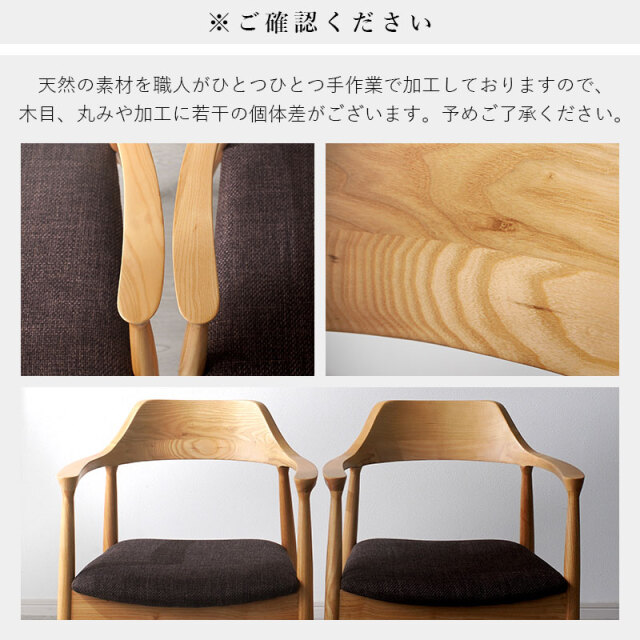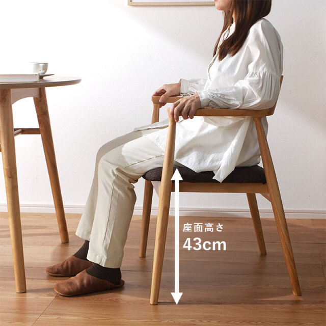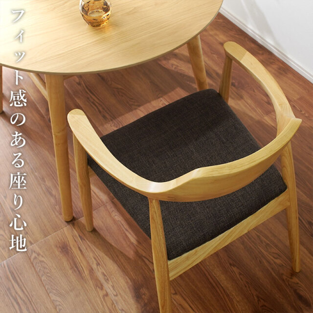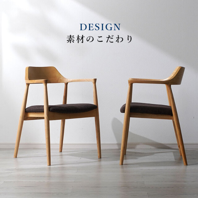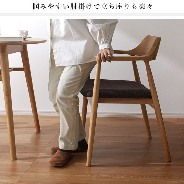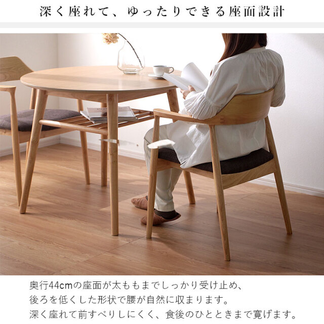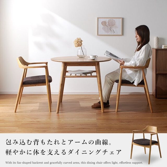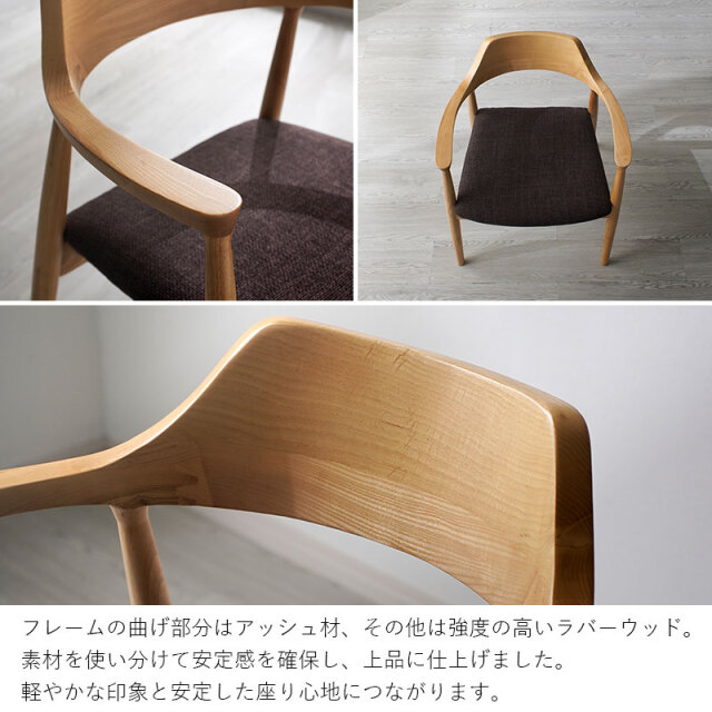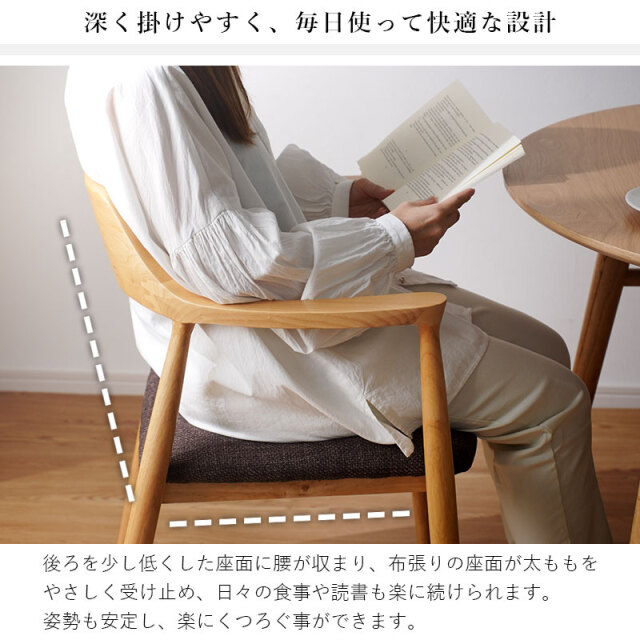 | 背からアームへ連なる曲線が背中と腕をやさしく受け止め、布張りの座面が体圧を程よく分散します。 肘掛けがある事で食事も読書も快適で、立ち座りも簡単に行えます。 フレームの曲げ部分はアッシュ材、その他は強度の高いラバーウッド。 素材を使い分けて安定感を確保し、上品に仕上げました。 軽やかな印象と安定した座り心地につながります。 後ろを少し低くした座面に腰が収まり、布張りの座面が太ももをやさしく受け止め、日々の食事や読書も楽に続けられます。 姿勢も安定し、楽にくつろぐ事ができます。 | |