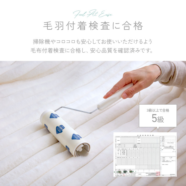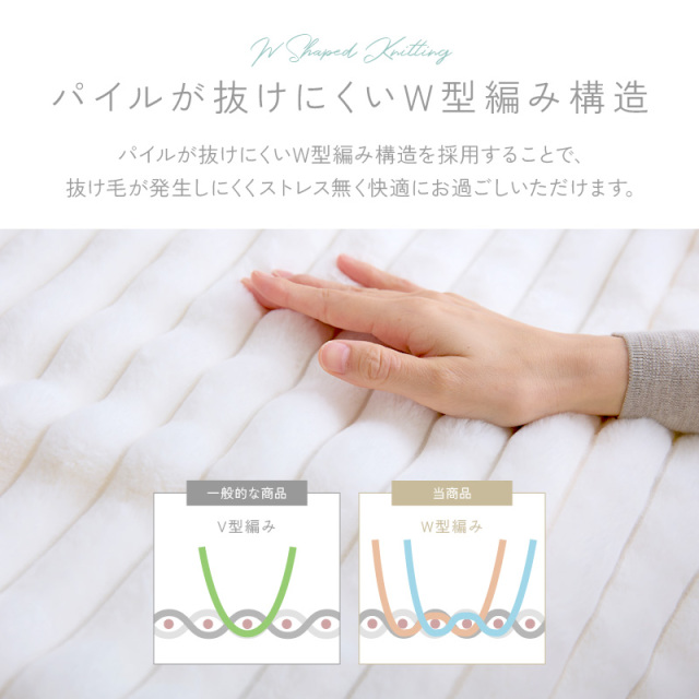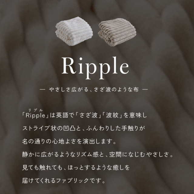 | やさしさが広がる、さざ波のような布 「Ripple」は英語で「さざ波」「波紋」を意味し、 ストライプ状の凹凸と、ふんわりした手触りが名の通りの心地よさを演出します。 静かに広がるようなリズム感と、空間になじむやさしさ。 見ても触れても、ほっとするような癒しを届けてくれるファブリックシリーズです。 上質でワンランク上のとろけるような新感覚の超なめらかタッチ。 まるでシルクのようになめらかなもこもこ肌ざわりが特長です。 さらに暖かい空気をキャッチして逃しにくいから、保温性も抜群でずっと暖かさが続きます。 パイルが抜けにくいW型編み構造を採用することで、抜け毛が発生しにくくストレス無く快適にお過ごしいただけます(一般的な商品はV型編み、当商品はW型編み)。 目付が330g/m²もあり、高密度だから熱を逃がさずしっかり保温。 空気をため込む層を作り、保温性にも優れています。 ご家庭の洗濯機で丸洗いでき、いつでも清潔を保てます。 もこもこの肌ざわりも復活し、心地よく使えます。 掃除機やコロコロも安心して使えるよう毛羽付着検査に合格し、安心品質を確認済みです(3級以上で合格・5級)。 | |