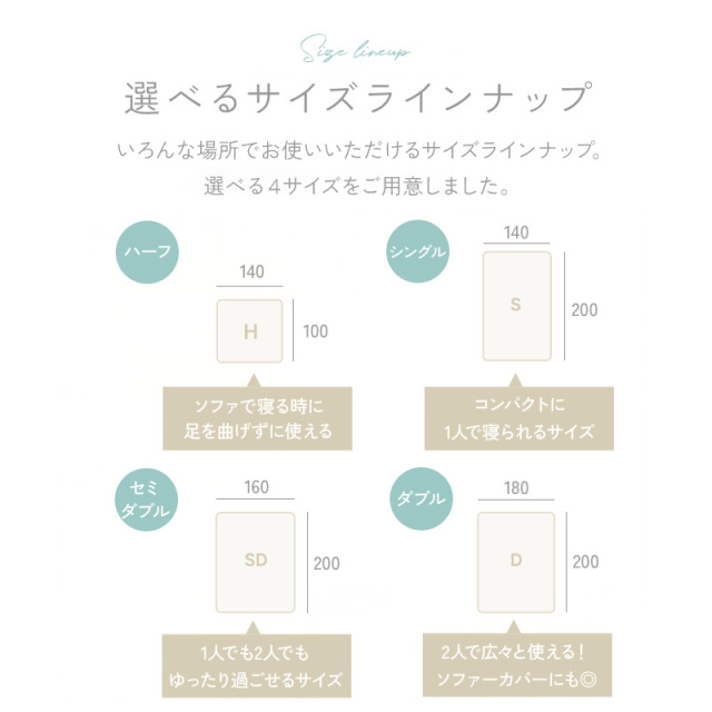| 商品重量 | 【140×100】(約)0.8kg 【140×200】(約)1.6kg 【160×200】(約)2kg 【180×200】(約)2.2kg |